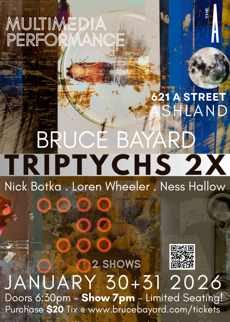 Bruce is a visual artist and performer who currently exhibits at The Talent Gallery in Talent Oregon. He enjoys finding ways to incorporate accident and randomness in his work.